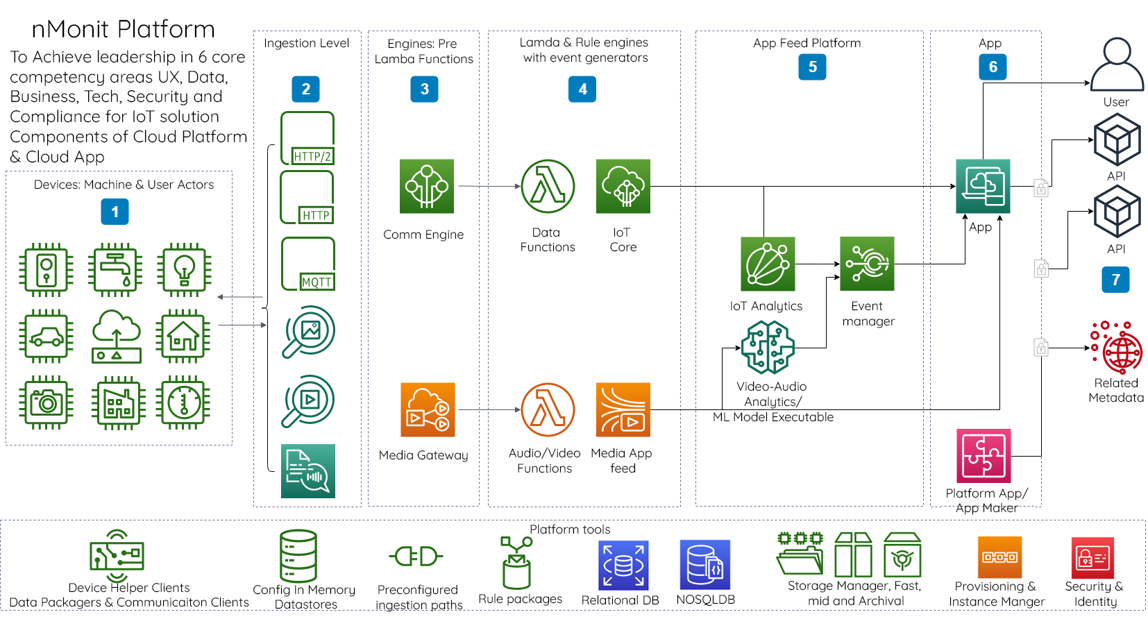 Event-based communication to the final user application presentation layer resides here, the Event manager is an integral part of our current application. The IoT Analytics for Time series and Nontime series data as well as the VIdeo/Audio Analytics are provisioned here. Vertical specific functionality is available currently, needs to be built for platform along with bringing up /tear down functionality.